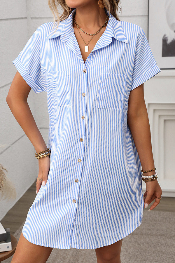 - Stripe Print Lapel Short Sleeve Shirt Dress