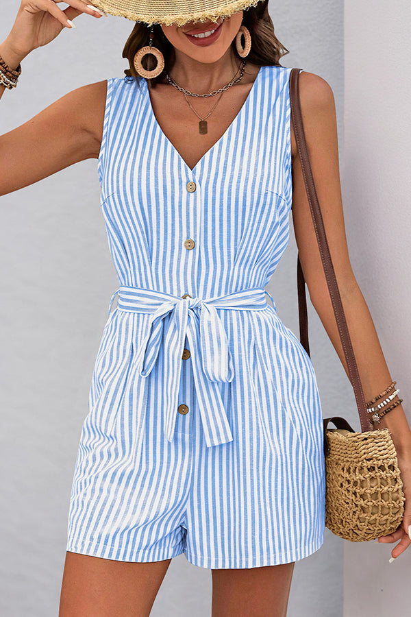 Stripe Print V Neck Tie Waist Rompers